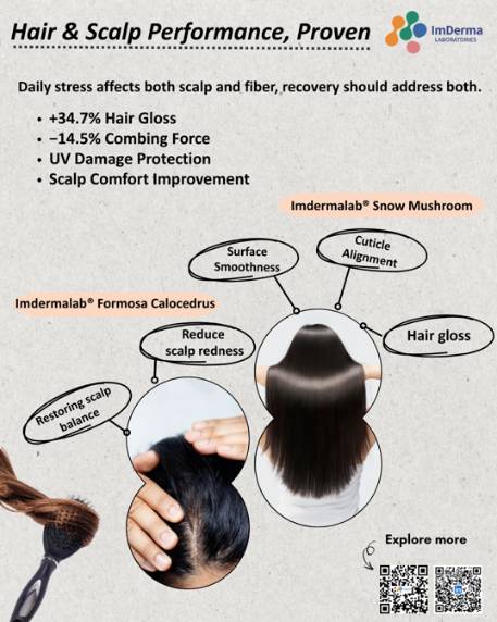 With increasing environmental exposure, frequent styling, and modern lifestyle stress, both hair fibers and scalp conditions are facing continuous challenges beyond simple cleansing or conditioning. Daily UV exposure, friction, pollution, and barrier imbalance gradually disrupt cuticle alignment, reduce surface smoothness, and weaken scalp comfort — leading to dullness, rough texture, and sensitivity. To support healthier hair and scalp under these cumulative stressors, ImDerma introduces a performance-driven formulation strategy, focusing on structural conditioning, moisture retention, surface protection, and scalp stabilization — delivering measurable improvements without aggressive stimulation.